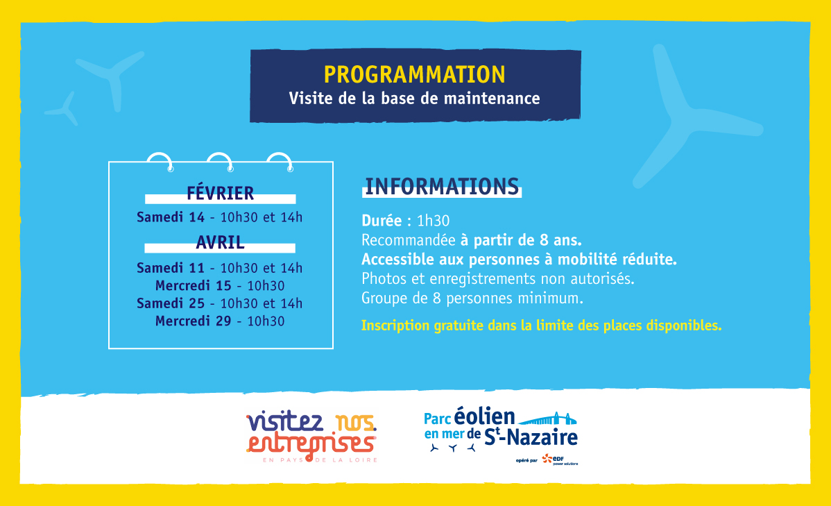 Avec Visitez Nos Entreprises en Pays de la Loire, la base de maintenance du parc éolien en mer de Saint-Nazaire ouvre ses portes durant les vacances scolaires pour vous faire découvrir les coulisses de l’exploitation et des activités de maintenance du parc.